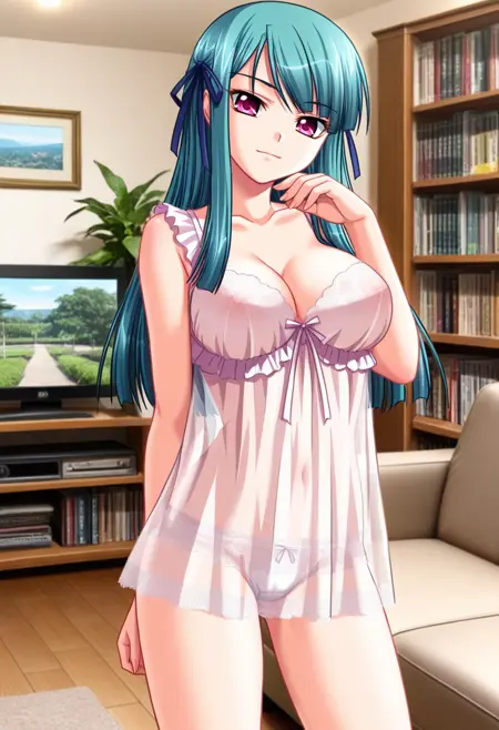 7 胸元、ナイトガウン、透け感、白いパンツ、レース、フリル