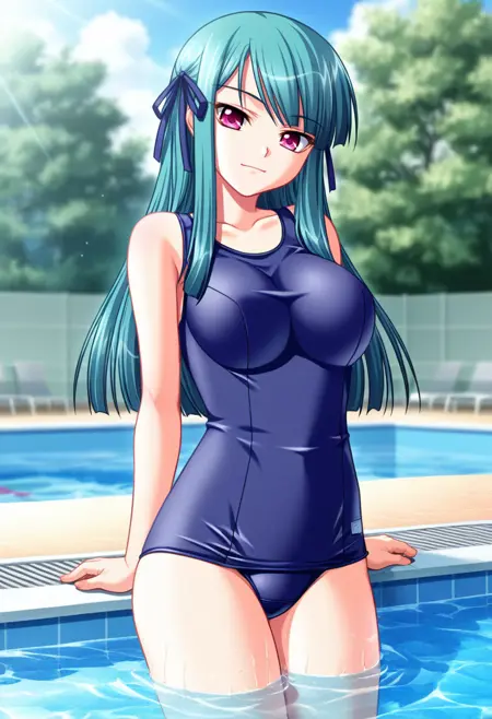 ピンクの目、水色の髪、ロングヘア、青い髪リボン