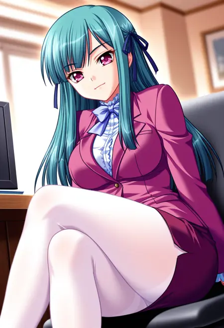 1 ピンクのジャケット、長袖、フリルシャツ、白いシャツ、青いボウタイ、鉛筆スカート、濃紺のスカート、白いパンティーストッキング