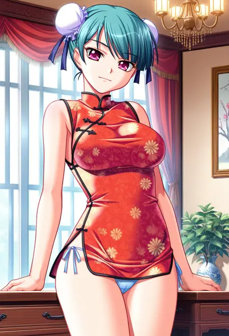 8 二つ結び、結び目カバー、ショートヘア、チャイナドレス、赤いマイクロドレス、ノースリーブ、花柄、サイドタイパンツ、青いパンツ
