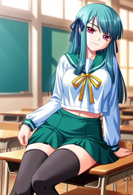 2 学ラン、緑色のセーラー襟、黄色いリボン、白いシャツ、長袖、へそ、プリーツスカート、緑のスカート、ブラックのシンクストッキング