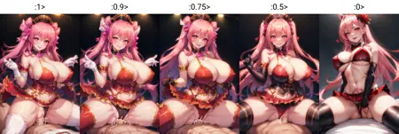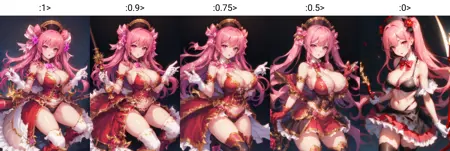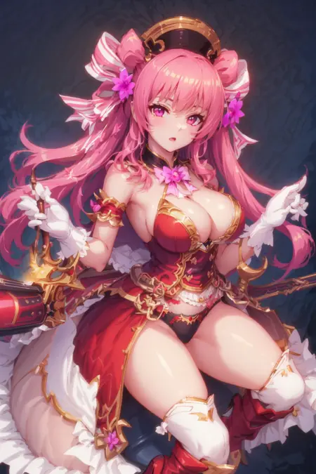 medium breasts, cleavage, cleavage cutout, underboob, underboob cutout, red dress, red bra, rubi corset, red showgirl skirt, checkered skirt, bare shoulders, white gloves, black panties, black thighhighs, frills, high heel boots, rubi knee boots,