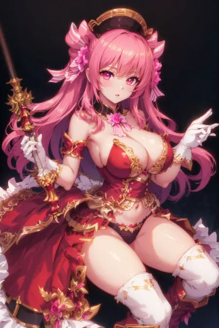 中等胸部,乳沟,乳沟切口,下乳,下乳切口,红色连衣裙,红色胸衣,露比紧身衣,红色歌舞伎裙,格子裙,裸露肩膀,白色手套,黑色内裤,黑色过膝袜,荷叶边,高跟靴,露比膝上靴,
