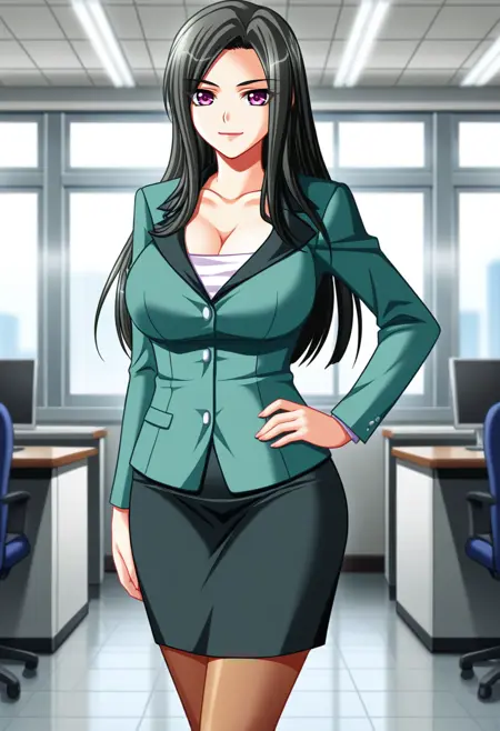 1 가슴 노출, 흰 셔츠, 연두색 재킷, 긴 소매, 진한 녹색 치마, 연필 치마, 갈색 팬티스타킹