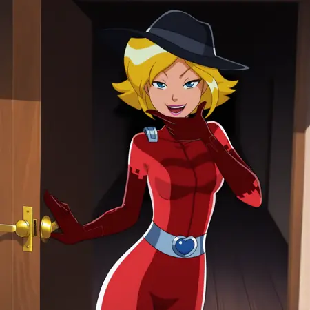 Clover: cl0ver, 1girl,ショートヘア,青い目,中程度の胸,金髪,唇,リップスティック,赤いスキンタイトスーツ,ベルト,スキンタイト