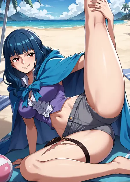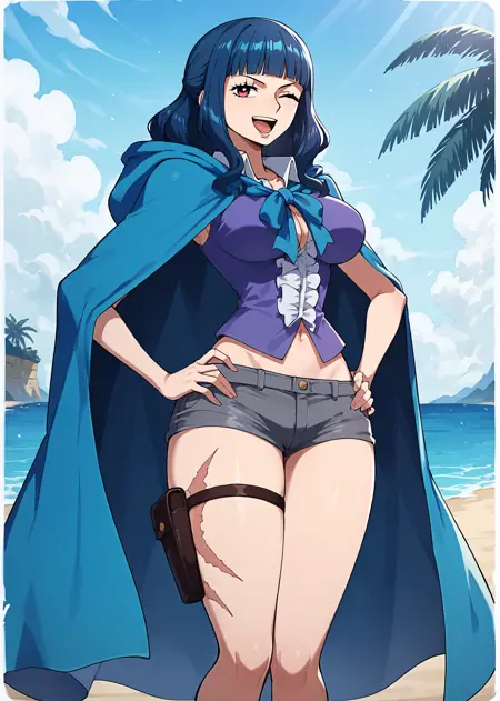 핵심 키워드: 1girl, solo, 검은 파란색 머리, 곧은 앞머리, 붉은 눈, 후드 달린 망토, 연한 파란색 망토, 연한 보라색 셔츠, 소매 없음, 흰색 칼라, 미니 반바지, 회색 반바지, 총집, "X" 모양 흉터, 검은 하이힐, 총집