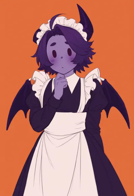 角色标签:紫色皮肤,紫色头发,短发,呆毛,紫色眼睛,橙色眼白,紫色角,断角,恶魔翅膀,紫色翅膀