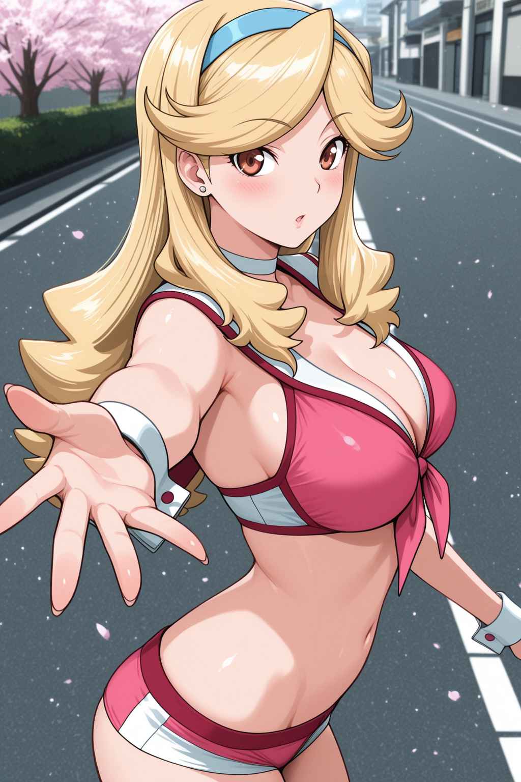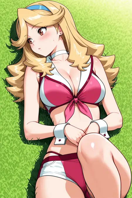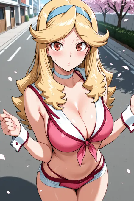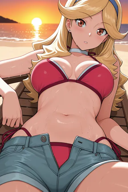 흰색 목걸이, 손목 팔찌, 앞쪽 매듭 상의, 핑크 비키니, 수영복, 핑크 반바지, 미크로 반바지, 세라후쿠, 가슴 노출