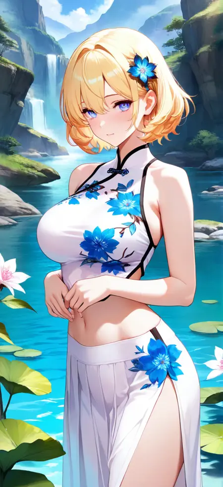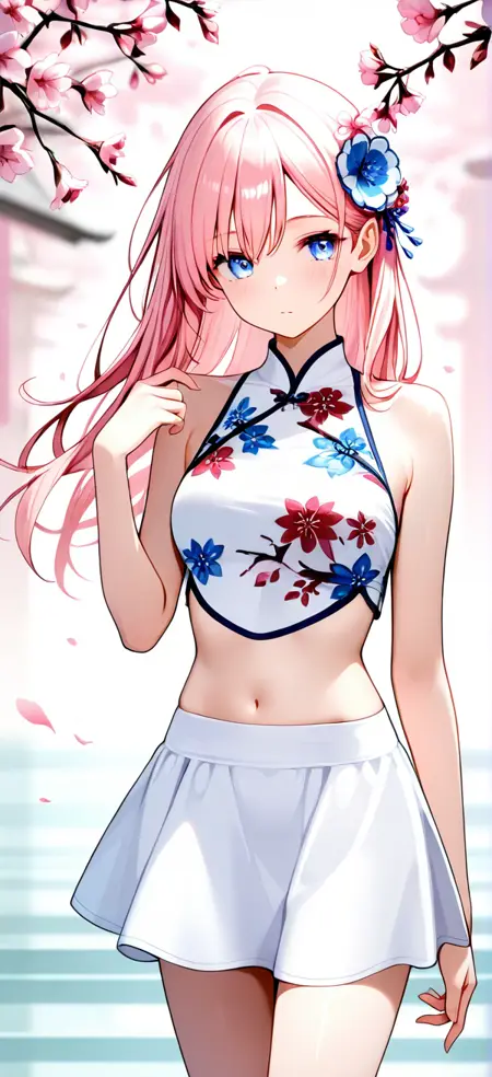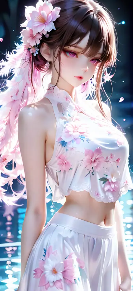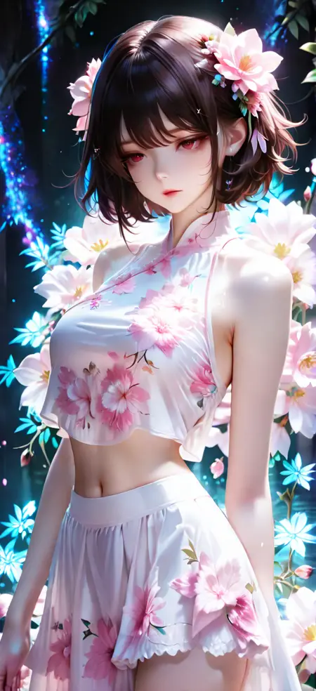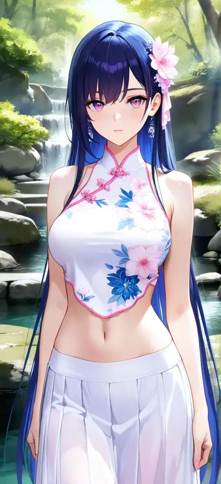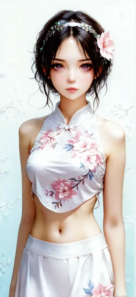 提示词:flower_bellyband, floral print, navel, white skirt, midriff