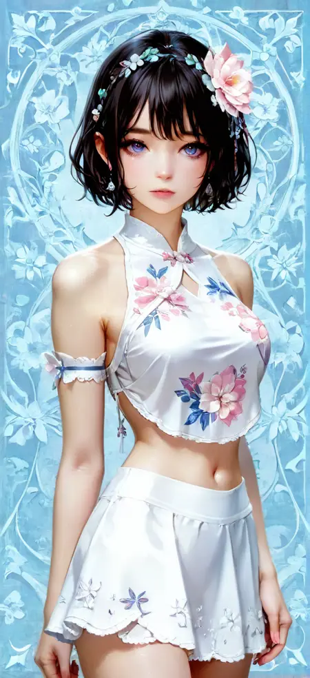 Prompt word : flower_bellyband, floral print, navel, white skirt, midriff