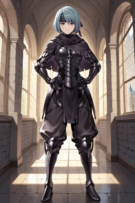 prompt: 1girl, solo, beruka \(fire emblem\), blue hair, short hair, headband, capelet, armor, gauntlets, baggy pants, armored boots