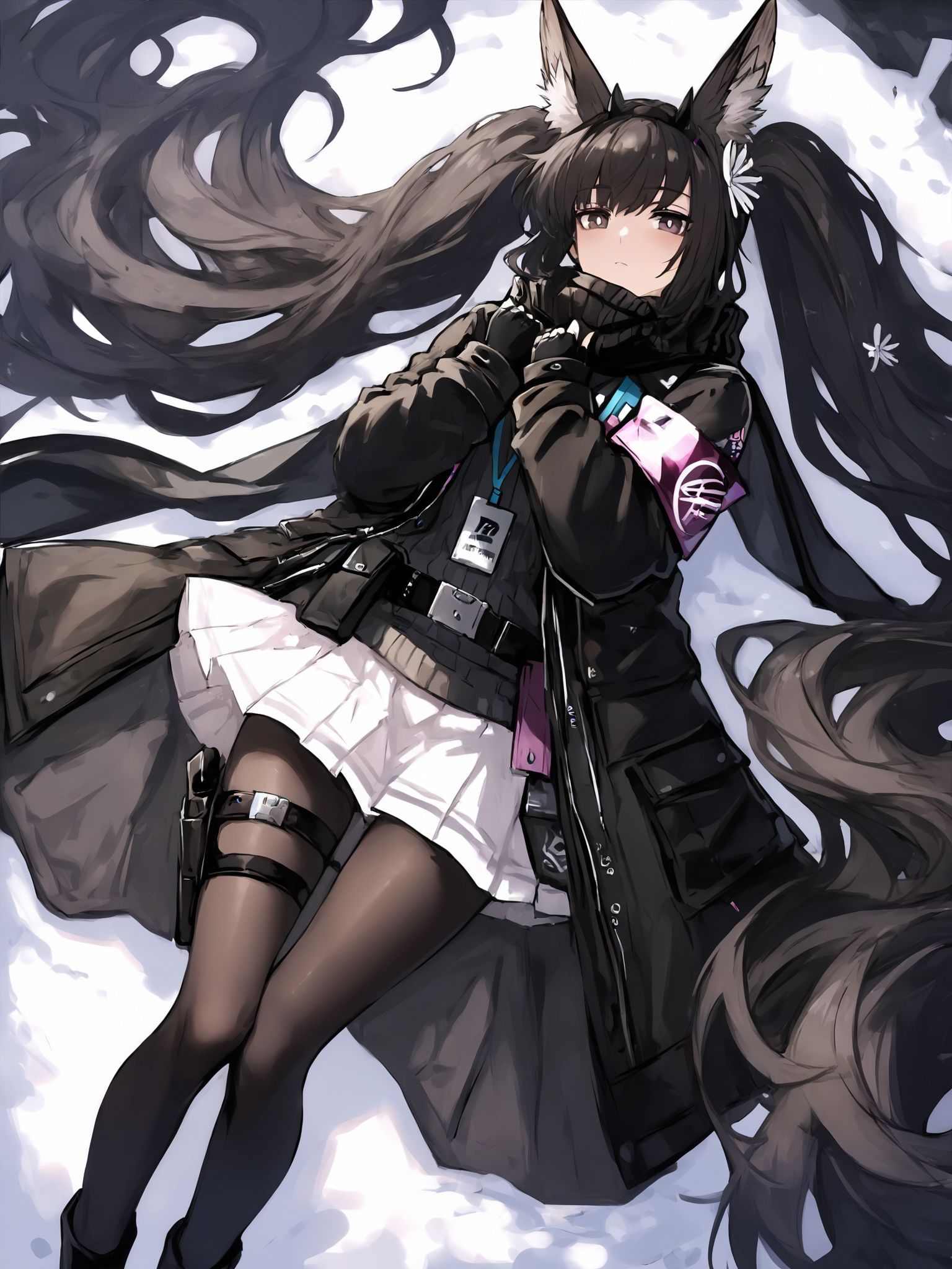 | 학습된 단어 | arntmonch,twintails,very long hair,black hair,fox ears,animal ear fluff,purple eyes,brown eyes,bright pupils,black hairband,horns,hair flower,white flower,복사됨! black coat,long sleeves,ribbed sweater,black scarf,armband,belt,id card,pleated skirt,white skirt,miniskirt,black pantyhose,thigh strap,holster,black footwear,복사됨! |