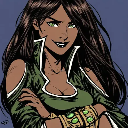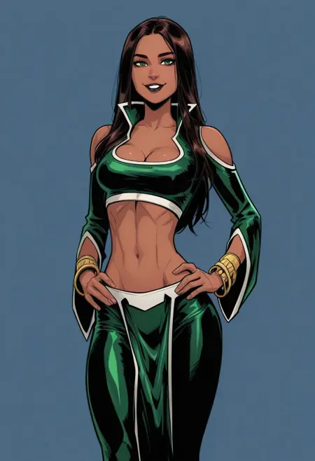 | 训练词汇 | 2d, 1girl, solo, Talia Al Ghul, dark-skinned female, green eyes, dark lips, long hair, dark brown hair, green crop top, shoulder cutouts, cleavage, popped collar, long sleeves, loose sleeves, gold jewelry, gold wristbands, midriff, navel, green crotch curtain, green pants已复制! |