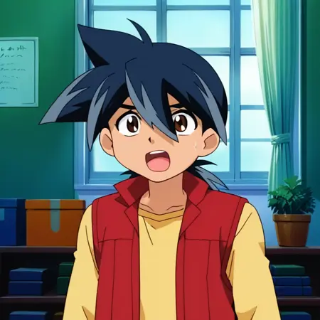 프롬프트: 남성, 짙은 파란색 머리카락, 뾰족한 머리카락, 폰테일, 야구 모자, 뒤집어 쓴 모자, 갈색 눈, 노란 셔츠, 긴 소매, 소매 말아올린, 빨간 조끼, 열린 옷, 손가락 없는 장갑, 바지, 양말, 신발, 실내(도장/샤oji), 실내(교실/선반/상자/창문/커튼/화분), 실내(경기장/관중/좌석/계단/문), 야외(공원/푸른 하늘/구름/잔디/관목/나무), 야외(주택가/하늘/거리/집/벽돌 벽/녹지/멀리 보이는 건물), 야외(야생/바위)