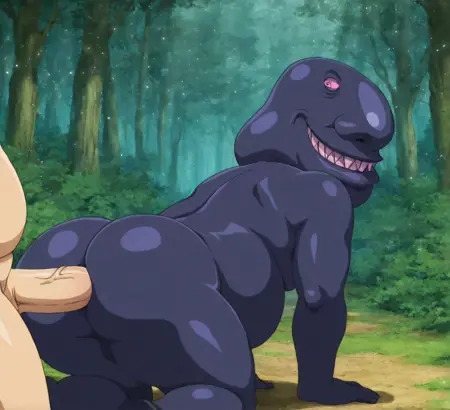 Ojama_Black, humanoid, purple body, big head, big nose, pink sclera, fat, belly, moobs, fat legs, fangs, red thong, floral print, underwear only