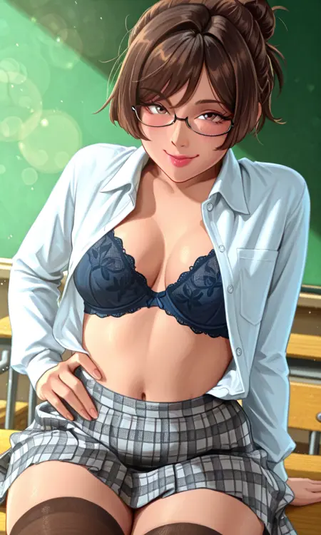 takoark, 黑发, 发髻, 单马尾发髻, 棕发, 眼镜, 半框眼镜, 黑框眼镜, 下框眼镜, 中等胸围, 校服, 肚脐, 替换服装, 长袖, 有领衬衫, 白色衬衫, 开襟衬衫, 衬衫, 穿着敞开, 文胸, 过膝袜, 裙子, 格子裙,