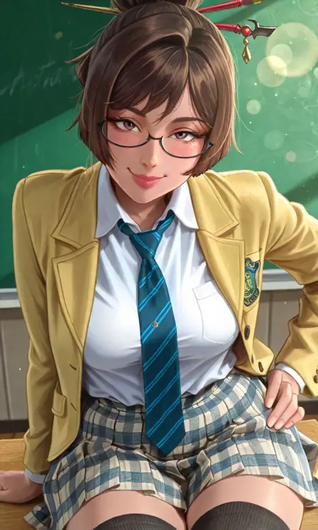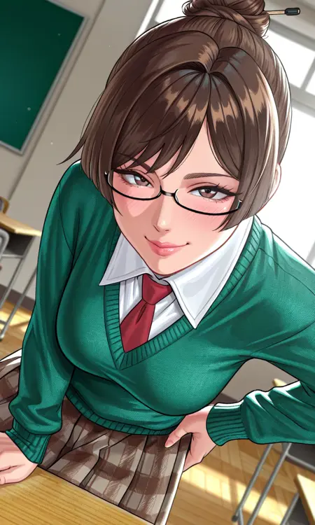 takoark, 黑发, 发髻, 单马尾发髻, 棕发, 眼镜, 半框眼镜, 黑框眼镜, 下框眼镜, 中等胸围, 校服, 毛衣, 绿色毛衣, 长袖, 红色领带, 白色衬衫, 有领衬衫, 百褶裙, 裙子, 格子裙,