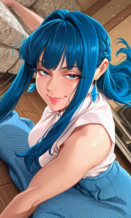 kuuark, mature female, haircut1, hair intakes, sidelocks,  braid, long hair, blue hair, sleeveless, sleeveless shirt, bare shoulder, collared shirt, earrings, white shirt, long skirt, blue skirt,