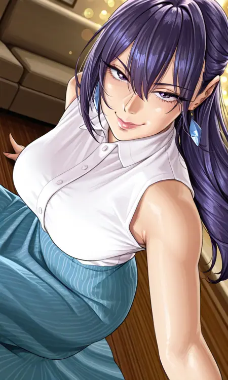 kuuark, mature female, haircut2, hair between eyes, half updo, long hair, purple hair, sleeveless, sleeveless shirt, bare shoulder, collared shirt, earrings, white shirt, long skirt, blue skirt,