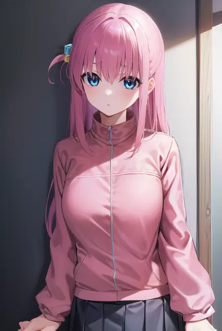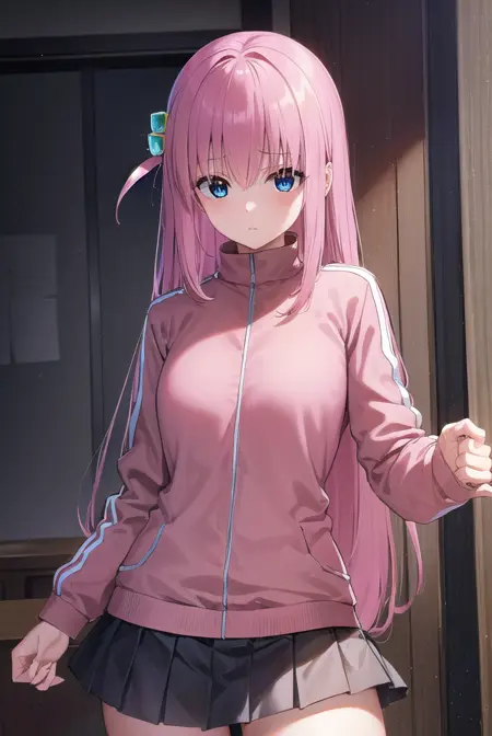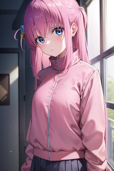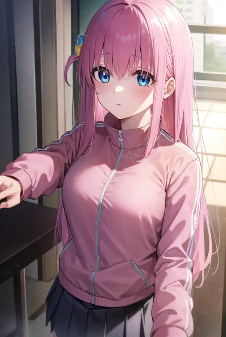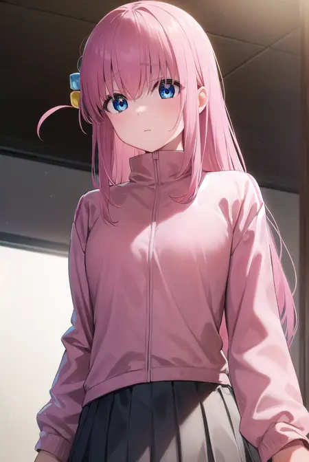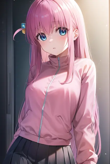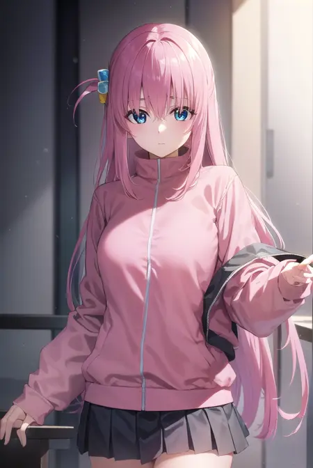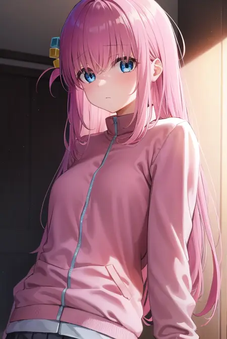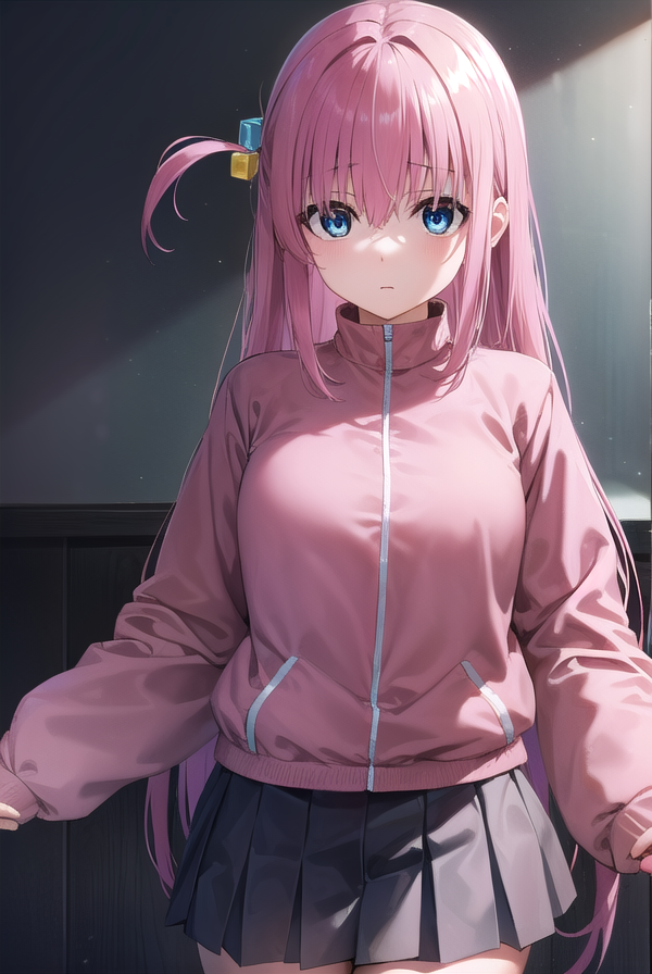 hitori gotou, blue eyes, cube hair ornament, hair between eyes, hair ornament, pink hair, one side up, long hair,