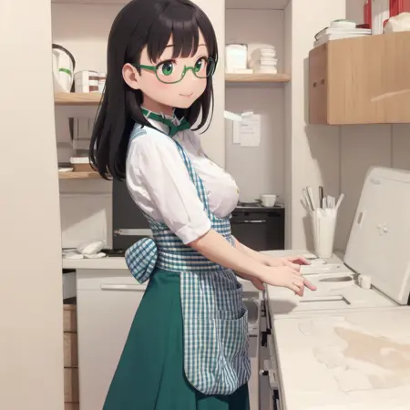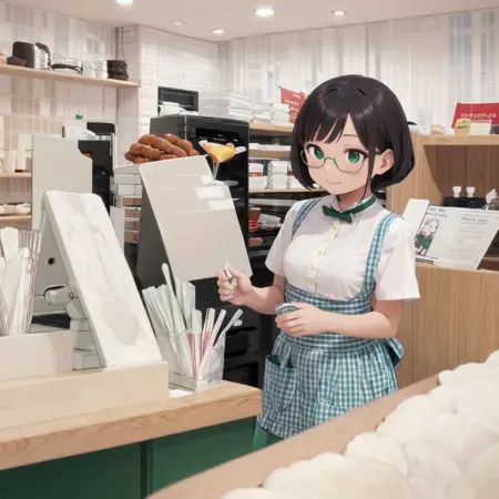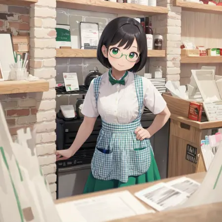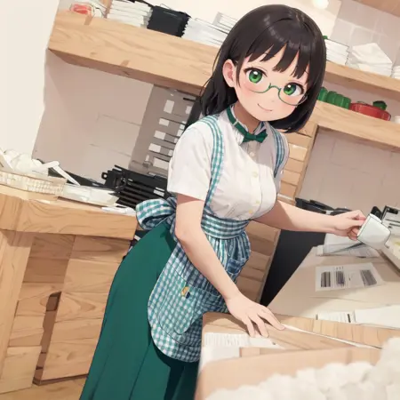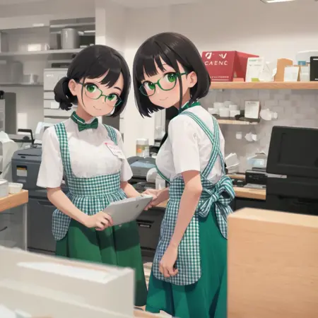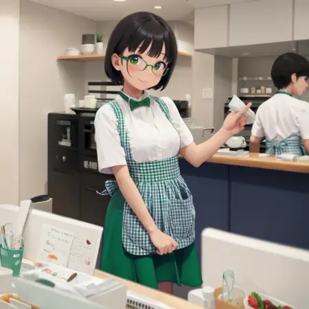 KSU, 넥타이, 앞치마, 흰 셔츠, 치마, 단축 소매, 허리 높은 치마, 녹색 넥타이, 녹색 리본, 녹색 치마, 체크무늬, 웨이트리스, 단추, 유니폼, 주머니, 직원 유니폼, 녹색 앞치마, 가슴, 칼라 셔츠, 기ン함 앞치마