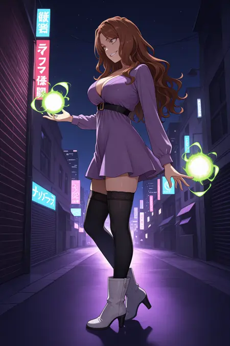 레일건 룩을 원한다면 "보라색 드레스, 긴 소매, 가슴 노출, 검은 벨트, 짧은 드레스, 검은 허벅지 스타킹, 흰색 부츠, 하이힐 부츠"를 추가하세요.