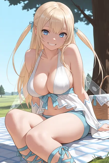 为呈现她的典型造型,请添加 "透明翅膀,精灵翅膀,发带,淡蓝色丝带,白色连衣裙,无袖,露胸,露脐,淡蓝色腰带,淡蓝色短裤,超短裤,白色护臂,角斗士凉鞋,蓝色鞋履"。