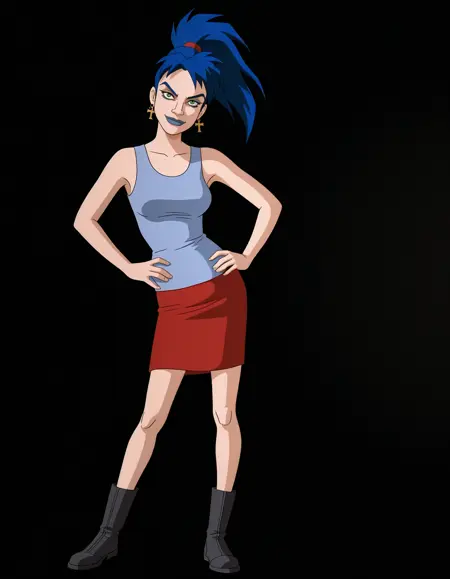 ポニーテール、クロスイヤリング、タンクトップ、赤いスカート、ブーツ