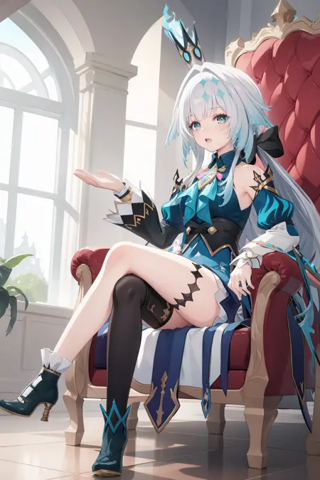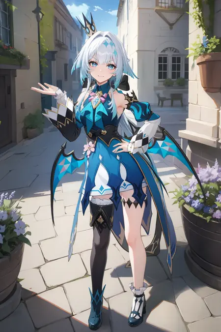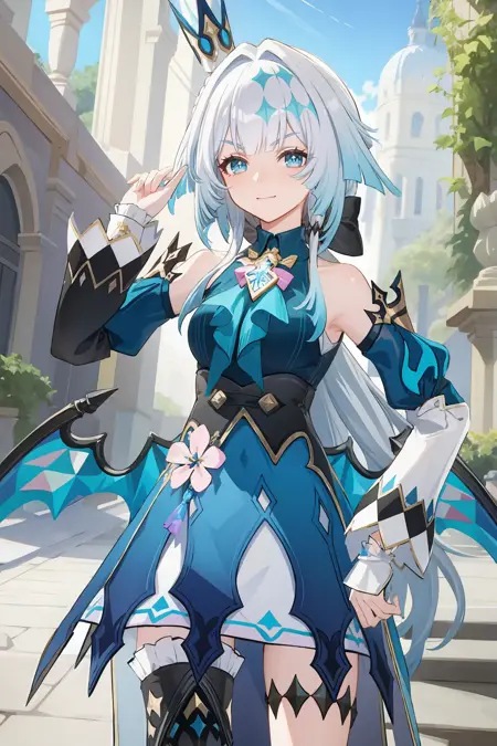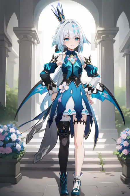 기본 의상용 추가 프롬프트: mini crown, ponytail, hair bow, multicolored ascot, blue sleeveless layered dress, detached juliet sleeves, black single thighhigh, thighlet, frilled single sock, high heel boots