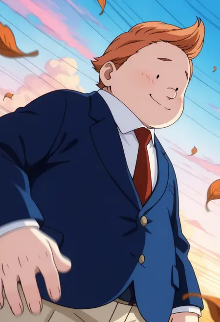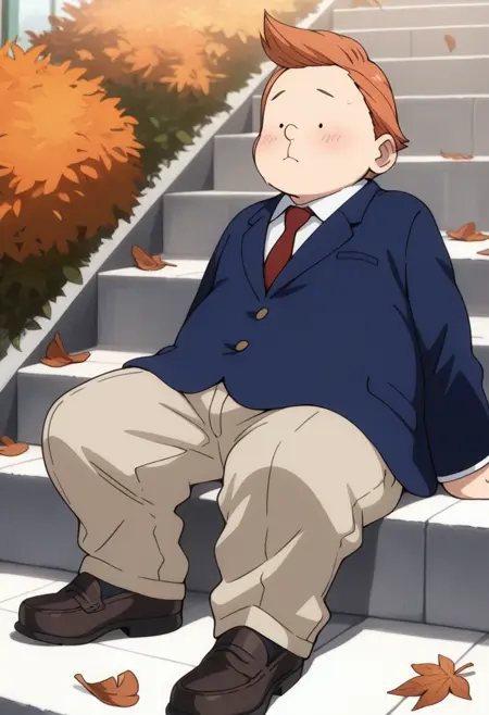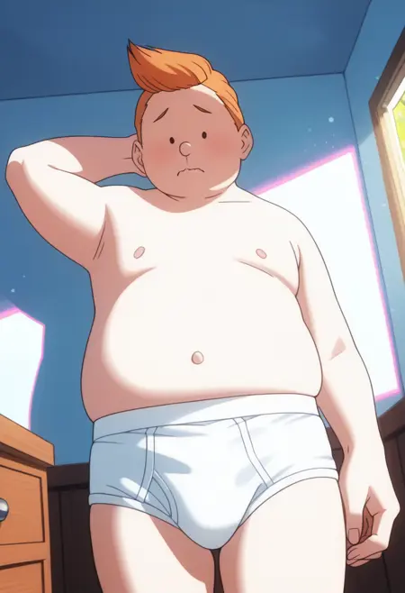 bnkdadant, 1boy, aged_up, orange hair, short hair, dot eyes, chubby, solo,