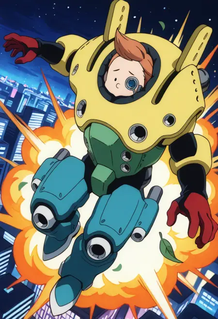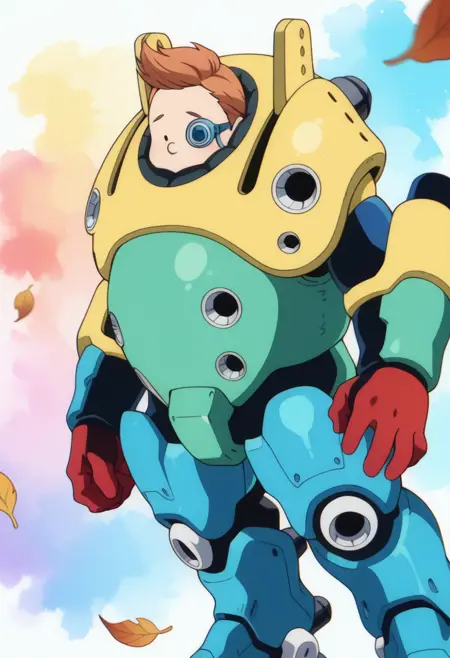 no_mouth, covered_mouth, power_armor, yellow_mechanical_chest, green_mechanical_torso, yellow_mechanical_elbow, red_gloves, blue_mechanical_legs,