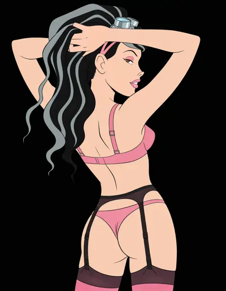 服装:领圈、束腰、露肤设计、臂环、超短裙、吊袜带、粉红色长筒袜——我们其实从未真正看到她的靴子,只知道那是及膝靴;在展示时,我只是随意添加了一些我觉得适合她和这套服装的元素。