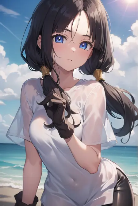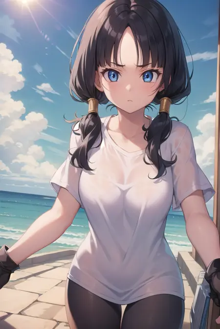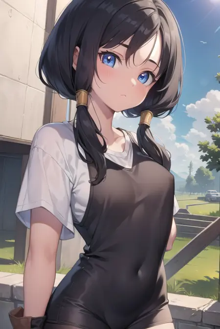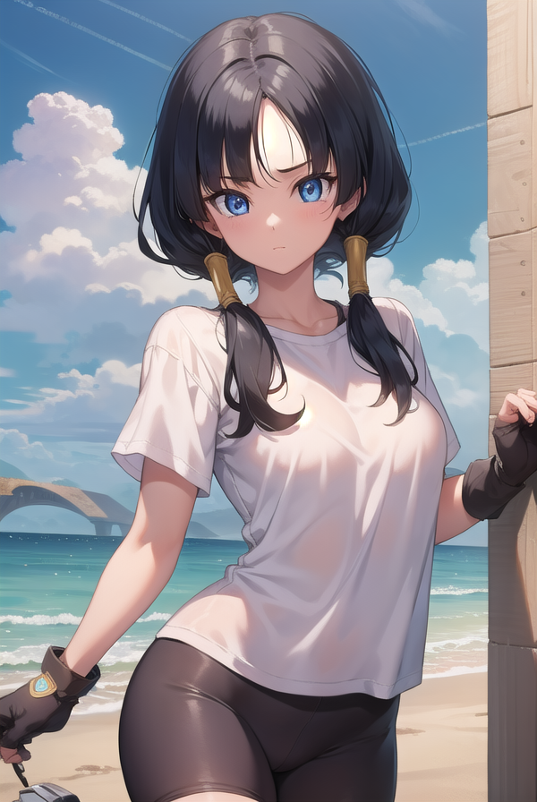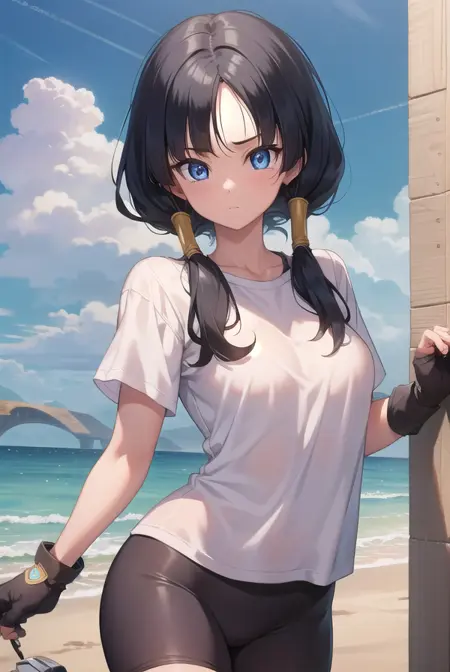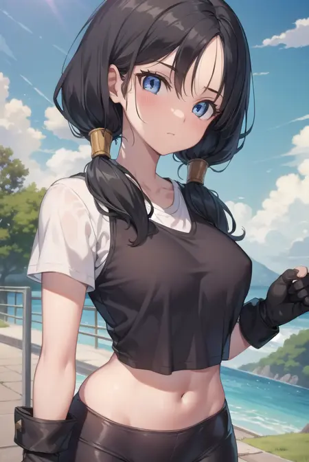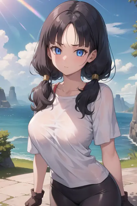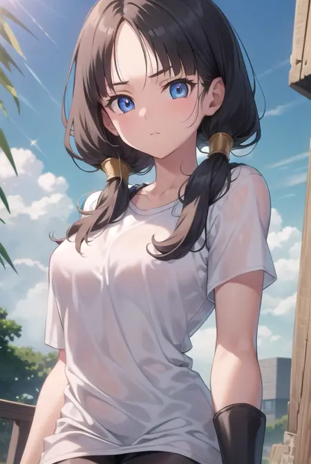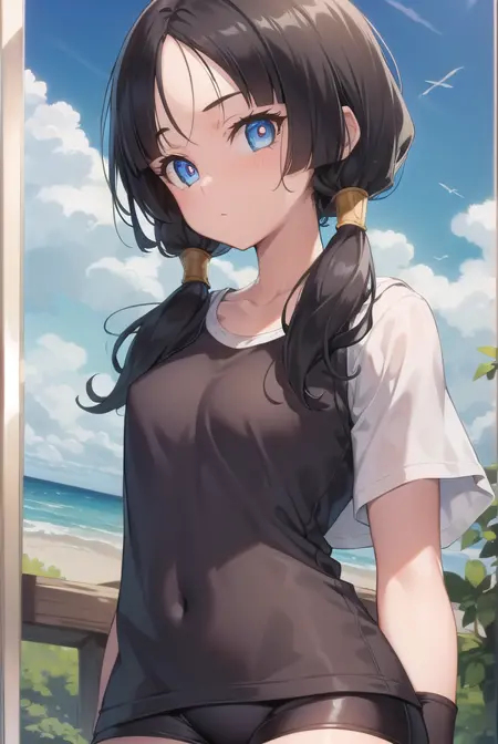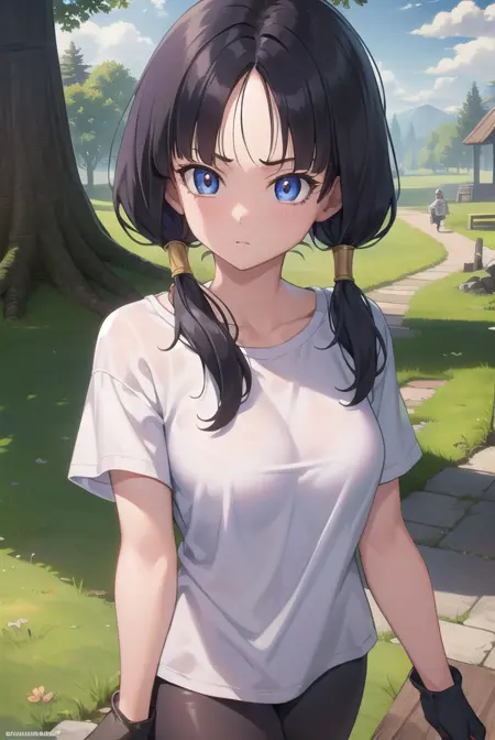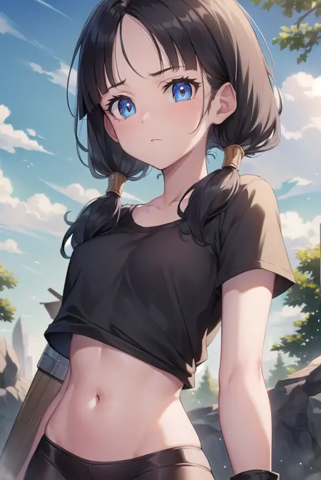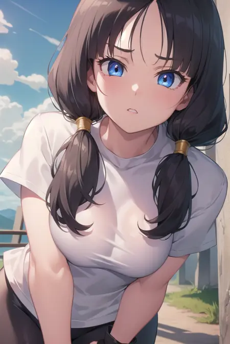 videl, 검은 머리, 파란 눈, 속눈썹, (나누어진 앞머리:1.5), 트윈테일,