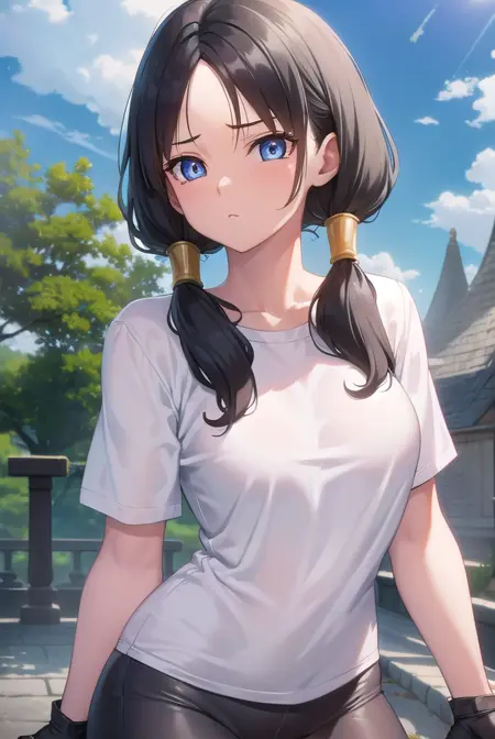 videl, black hair, blue eyes, eyelashes, (parted bangs:1.5), twintails,
