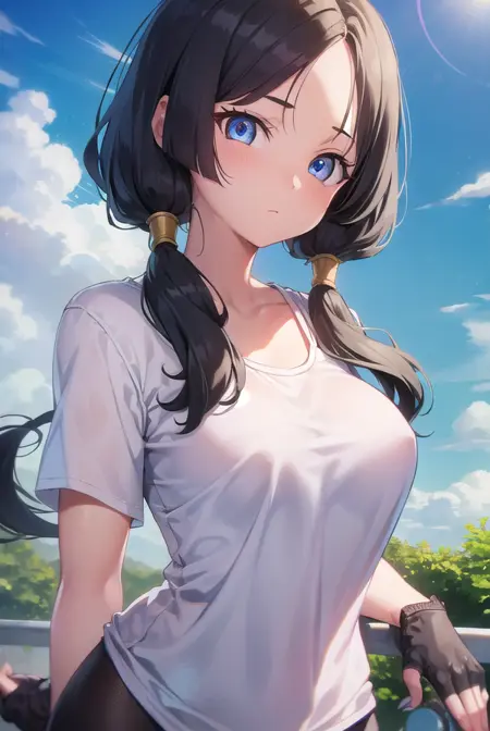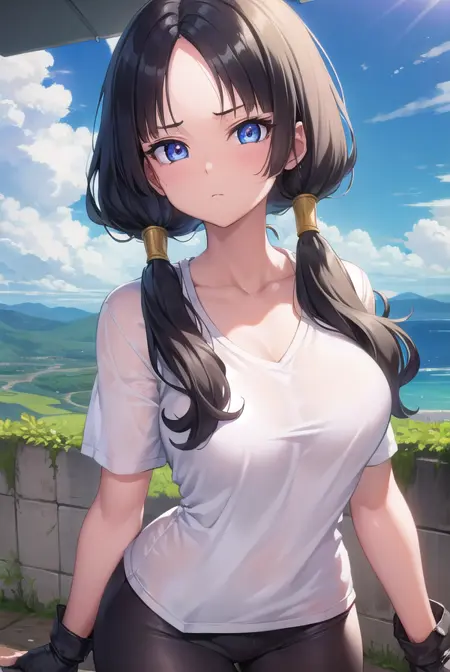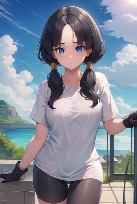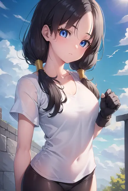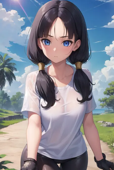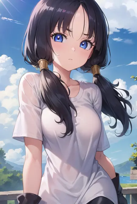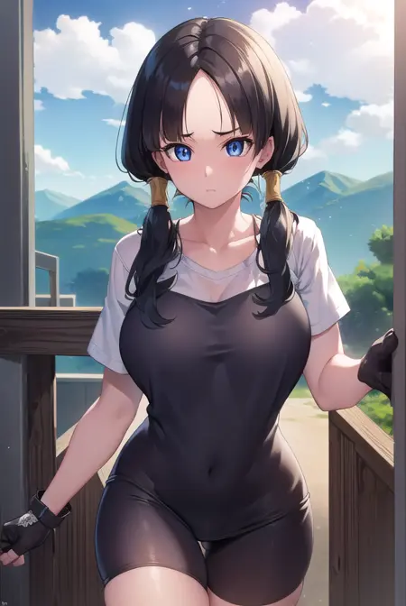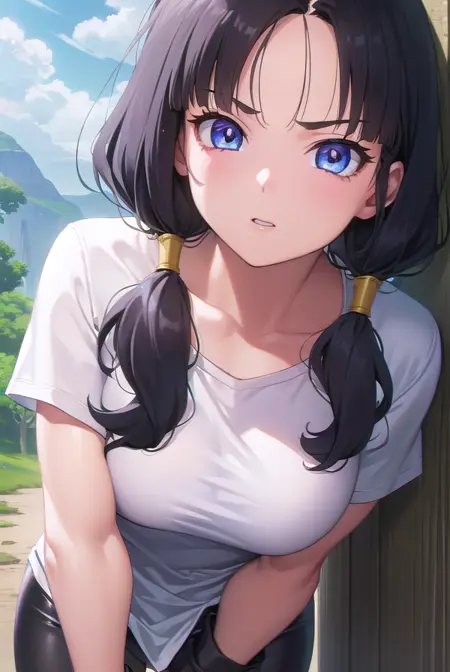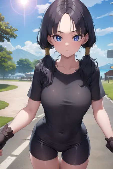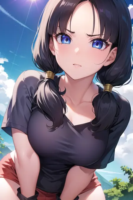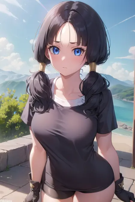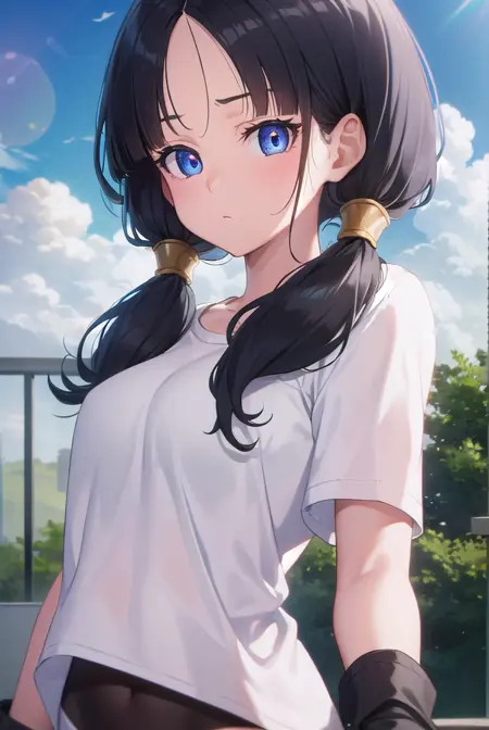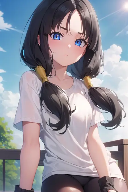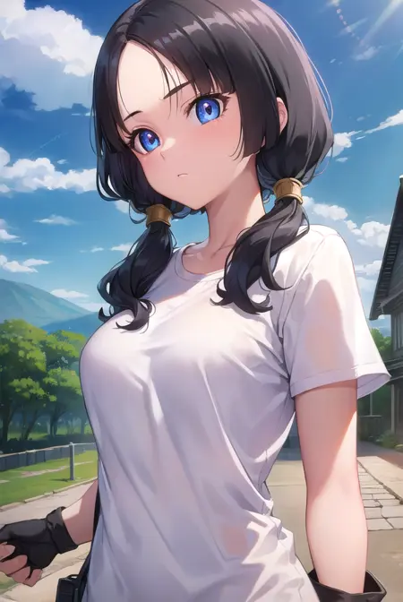 videl, 검은 머리, 파란 눈, 속눈썹, (나누어진 앞머리:1.5), 트윈테일,