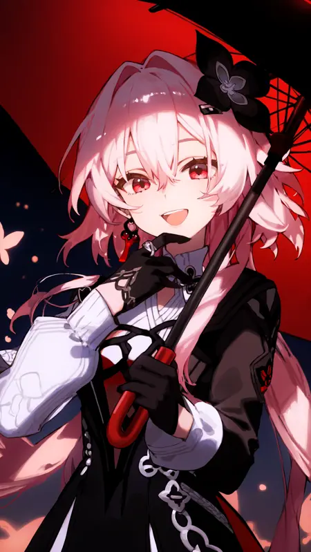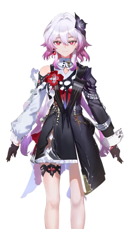 白色毛衣,白色衬衫,白色高领衫,长袖,手套,黑色手套,黑色头发花,多色服装,白色袖子,黑色袖子,不对称袖子,红花,黑色衬衫,肩部剪裁,单侧露肩,黑色裙子,