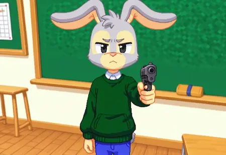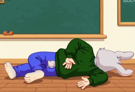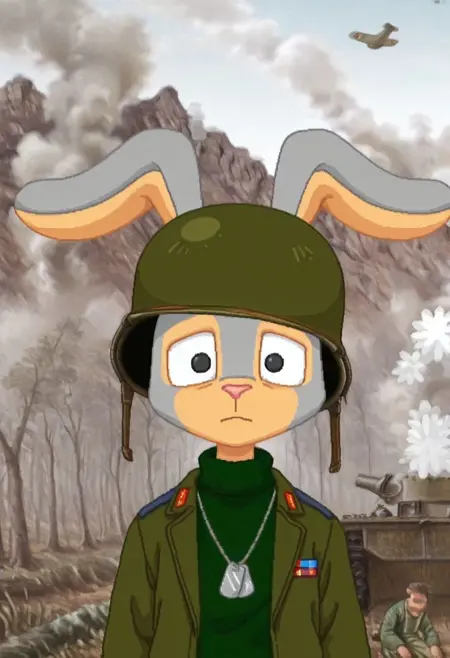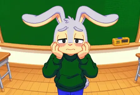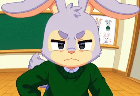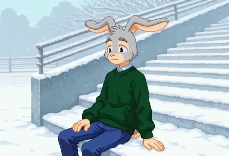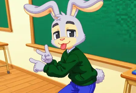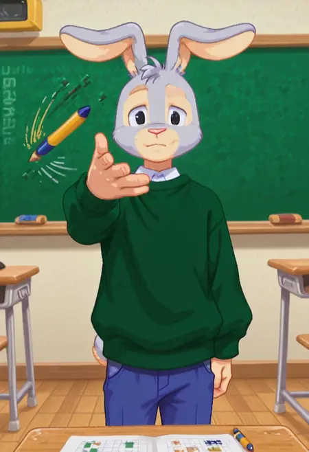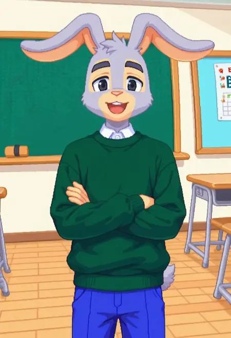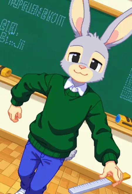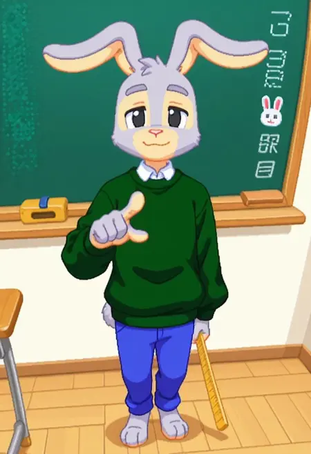 建议标签:Hopsalot,兔子,男性,绿色毛衣,长袖,红鼻子,蓝色裤子,灰色毛发,米色毛发,双色毛发