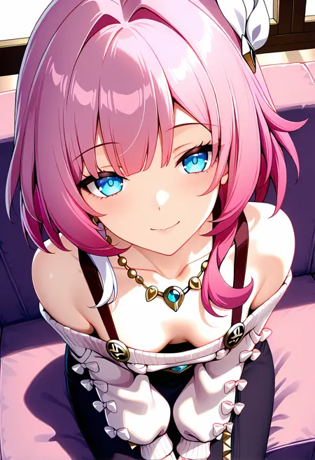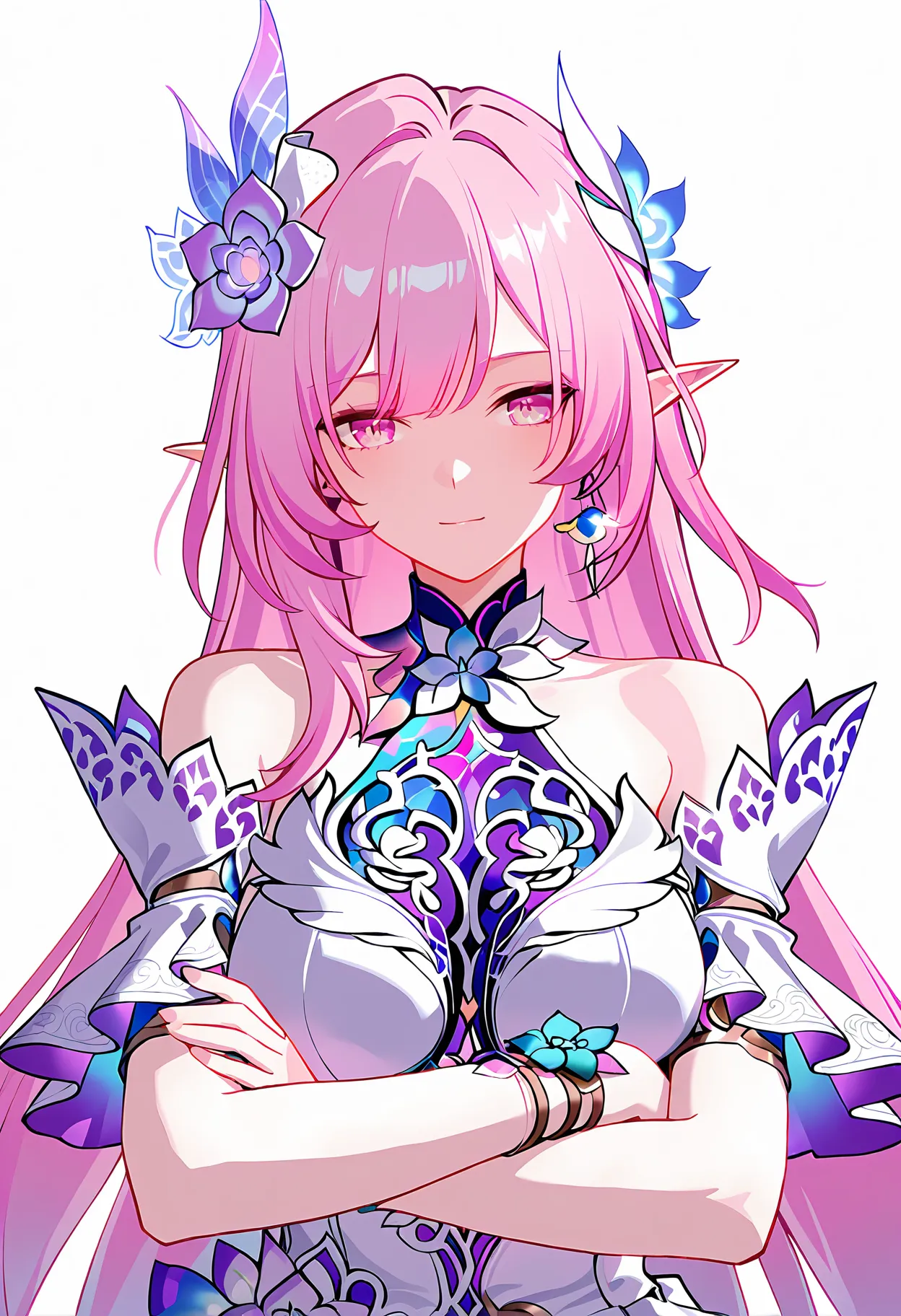 (cyrenes), 1girl, crossed arms, white background, simple background, looking at viewer, bare shoulders, dress, upper body, flower, jewelry, white dress, closed mouth, purple eyes, hair flower, elf, official alternate costume, purple flower, pink eyes, earrings, very long hair