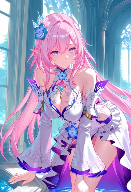 (cyrenes), 1girl, 両腕を組んだ, 白バックグラウンド, 簡単な背景, 視線を観察者に向けている, 肩を露出, ドレス, 上半身, 花, ジュエリー, 白いドレス, 口を閉じた, 紫色の目, 髪に花, エルフ, 公式の代替衣装, 紫の花, ピンクの目, ピアス, 非常に長い髪