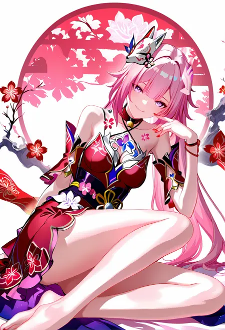 (cyrenes), white background, fox mask, mask on head, feet, red nails, nail polish, barefoot, looking at viewer, dress, bare shoulders, red dress, smile, choker, bare legs, criss-cross halter, flower tattoo, black choker, sash, sitting, breasts,