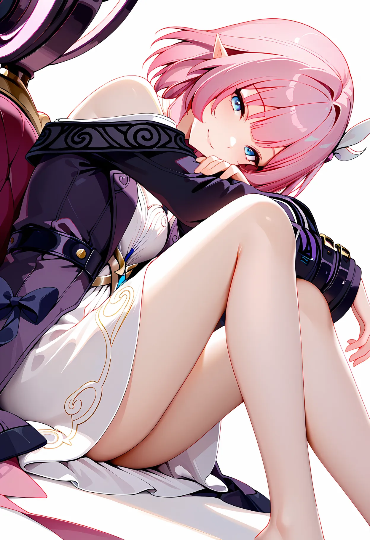 Cyrene, 1girl, solo, smile, dress, white dress, looking at viewer, bare shoulders, closed mouth, jacket, black jacket, sitting, long sleeves, open clothes, open jacket, thighs, legs, pointy ears, bare legs, white background