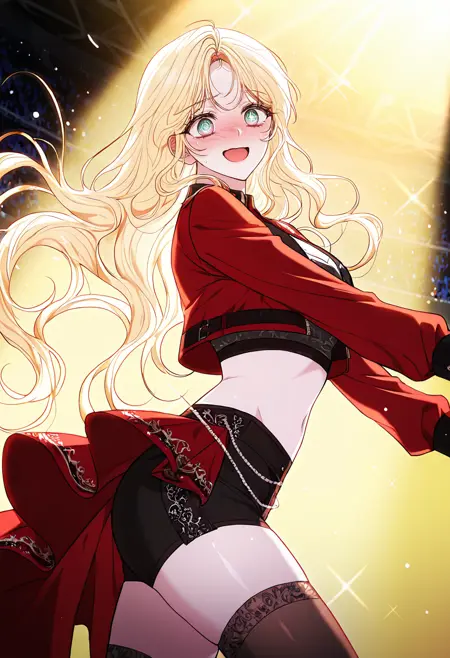 AriaGoldwyn, light yellow hair, parted hair, aqua eyes, (gradient eyes:1.2), pink eyes, sparkling eyes, long hair, wavy hair, shiny hair, long sidelocks, long eyelashes