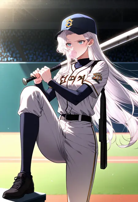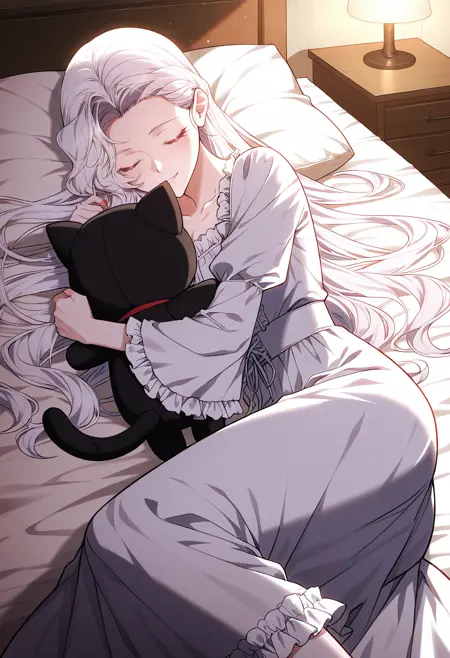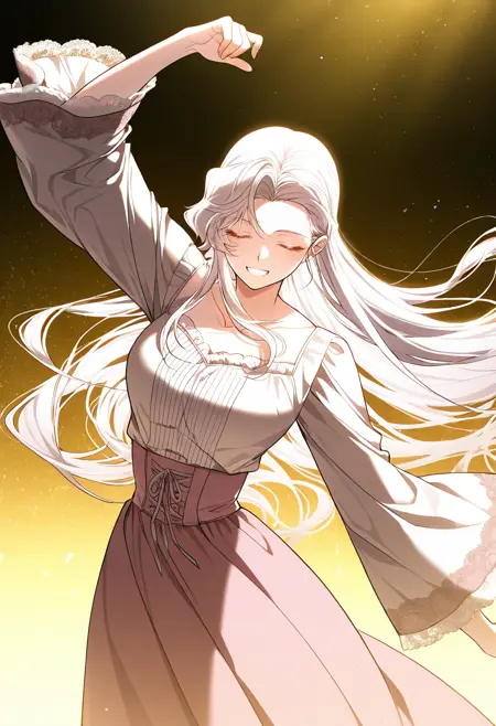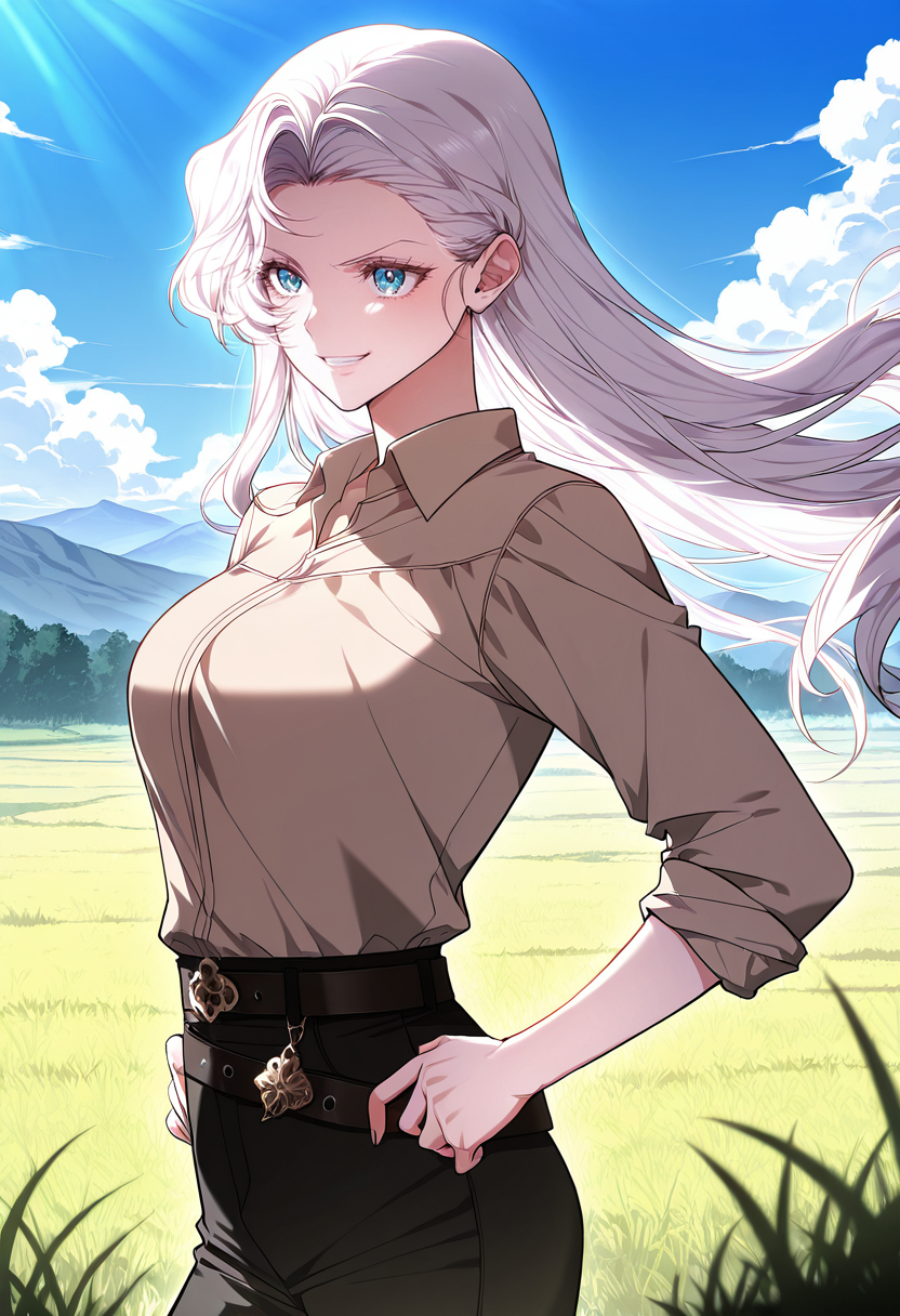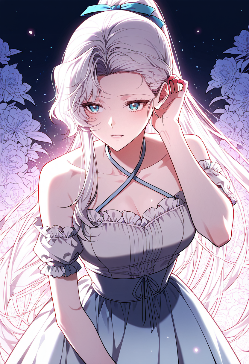 Astrea, white hair, long hair, asymmetrical bangs, parted bangs, curtained hair, hair behind ear, blue eyes