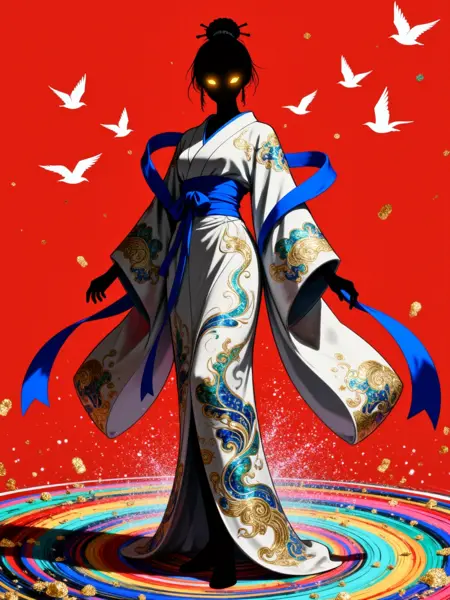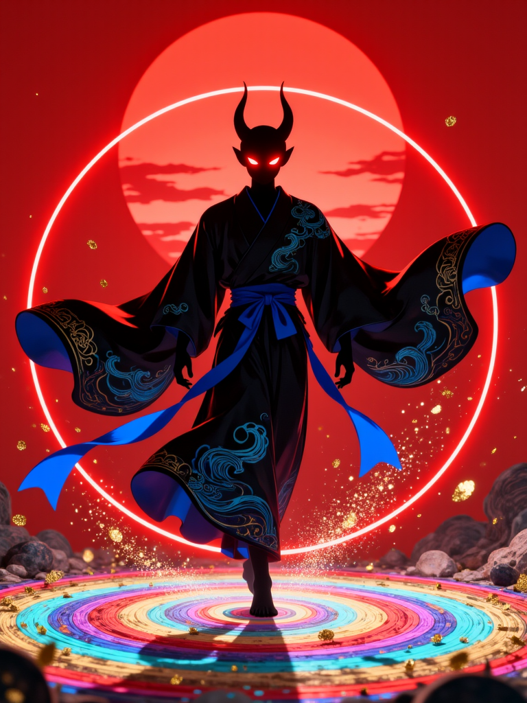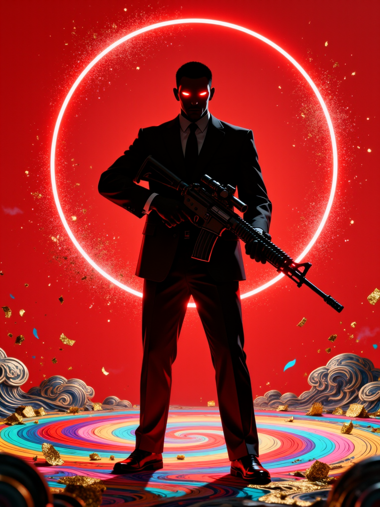 レインボーボルテックス。前面のカメラアングルから撮影されたデジタルイラストで、鮮やかな赤い背景に輝く円と抽象的な模様が描かれ、スーツを着てライフルを構えるスタイリッシュな男性のシルエットが中心に位置している。男性は真ん中で自信に満ちた姿勢をとり、黒いスーツを着て Assault Rifle を握っている。20代半ばの男性で、短い黒髪と赤く光る目を持つ。両手をポケットに突っ込み、決意に満ちた表情で観客を見つめている。背景には大きな赤い円があり、その中には金と青の渦巻き模様が広がり、男性の周囲は、渦巻く模様と金のコンフェティに包まれた混沌とした抽象的な風景となっている。全体の色調は主に赤と黒で構成され、男性と彼の武器に焦点が当たっている。