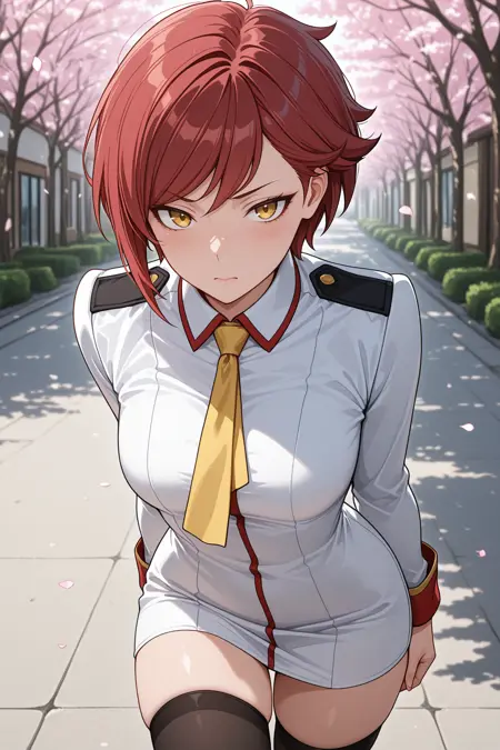 detached collar, yellow necktie, long sleeves, white uniform, black thighhighs
