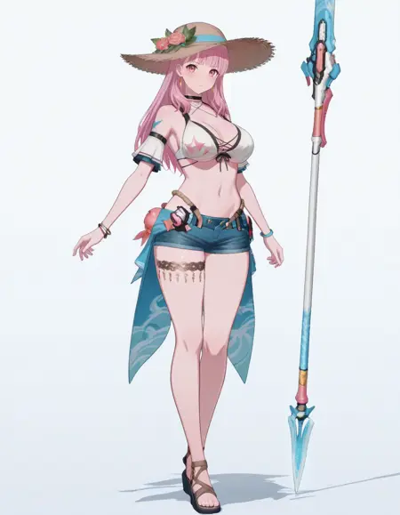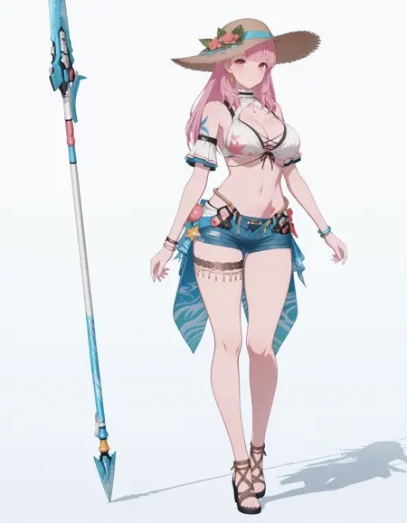 mai_pgr_awh_hlrc,long_hair,pink_hair,pink_eyes,large_breasts,straw_hat,hat_flower,bikini,detached_sleeves,denim_shorts,sandals,earrings,bracelet,tattoo,holding_polearm
