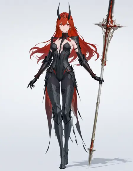 mai_pgr_vzw_yhgm,mature_female,(age_ip:1.5),long_hair,red_hair,hair_between_eyes,red_eyes,medium_breasts,black_horns,earrings,armored_leotard,black_armor,armored_boots,gauntlets,greaves,holding_polearm