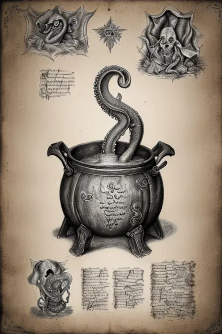 The idea behind this LoRa is to craft the hand-drawn pages of a long-forgotten fantasy/ancient/esoteric/mystery book, lost in the annale of time.