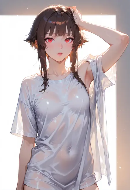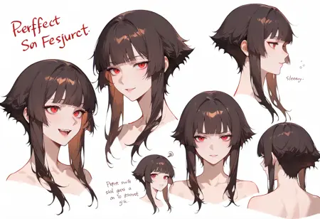 외모: 1소녀, 갈색 머리, 검은 머리, 빨간 눈, 단발, 앞머리, 앞치마, 옆머리, 긴 머리카락이 달린 단발