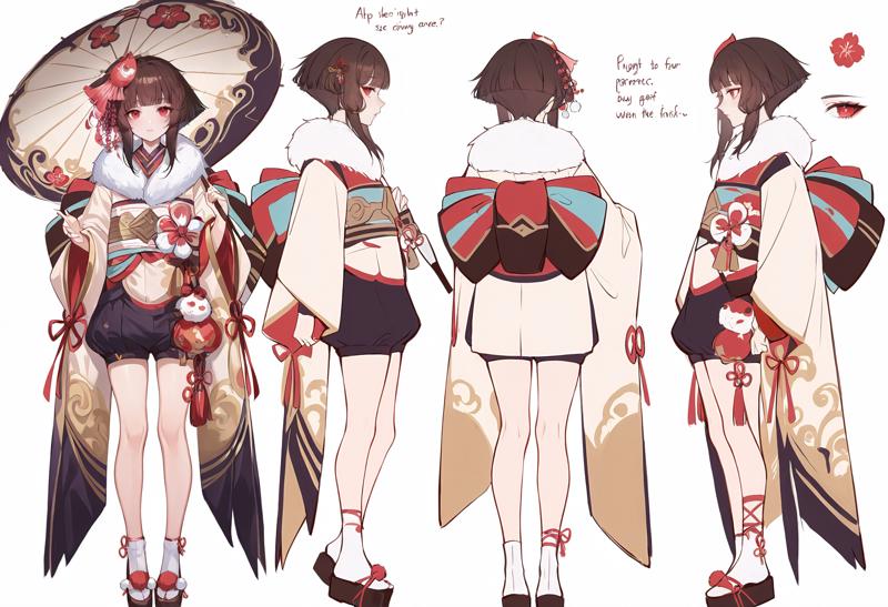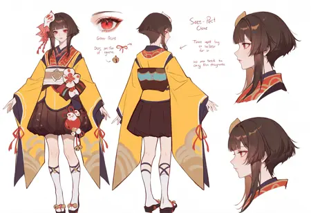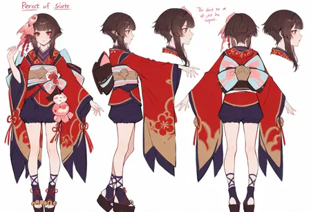 기본 스킨: 머리장식, 일본 복장, 기모노, 띠, 오비, 모래신, 넓은 소매, 종, 긴 소매, 반바지, 짧은 기모노, 치마, 플랫폼 신발, 화 floral 프린트